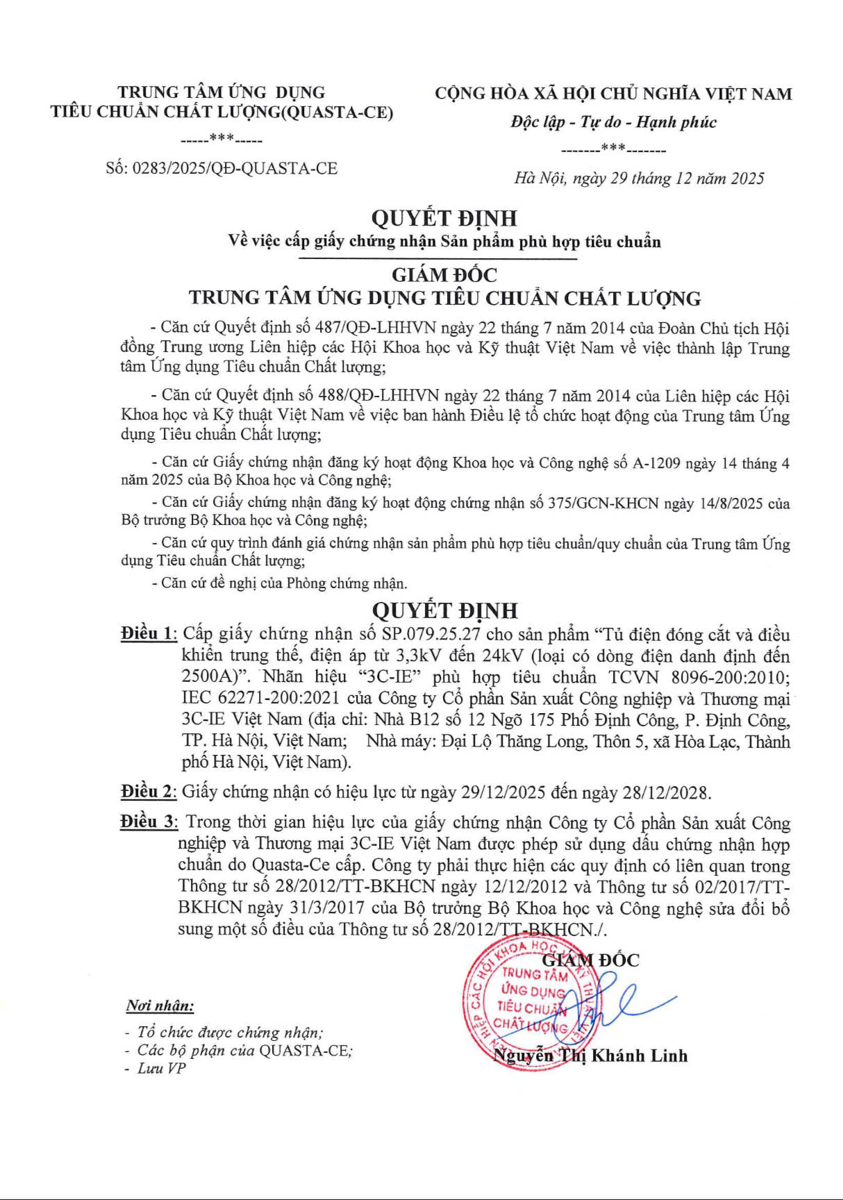 Ngày 29/12/2025, Công ty 3C-IE JSC đã được cấp giấy chứng nhận số SP.079.25.27 cho sản phẩm "Tủ điện đóng cắt và điều khiển hạ áp, điện áp từ 3,3kV đến 24kV (loại có dòng điện danh định đến 2500A)". Nhãn hiệu "3C-IE" phù hợp với tiêu chuẩn TCVN 8096-200:2010; IEC 62271-200:2021 của Công ty Cổ phần Sản xuất Công nghiệp và Thương mại 3C-IE Việt Nam.