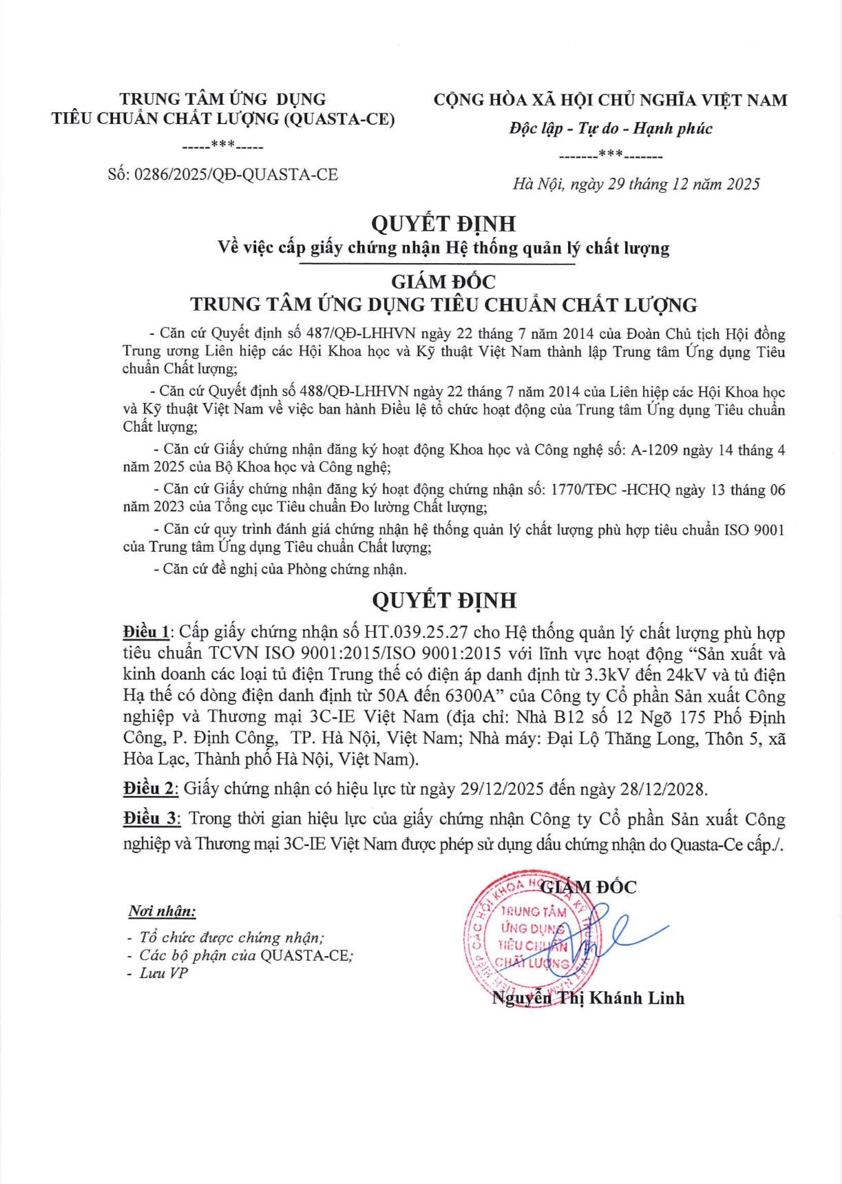 Ngày 29/12/2025, Công ty 3C-IE JSC đã được cấp giấy chứng nhận số HT.005.25.27 cho hệ thống quản lý chất lượng phù hợp tiêu chuẩn TCVN ISO 9001:2015/ISO 9001:2015 với lĩnh vực hoạt động "Sản xuất và kinh doanh các loại tủ điện Trung thế có điện áp danh định từ 3.3kV đến 24kV và tủ điện Hạ thế có dòng điện danh định từ 50A đến 6300A".
